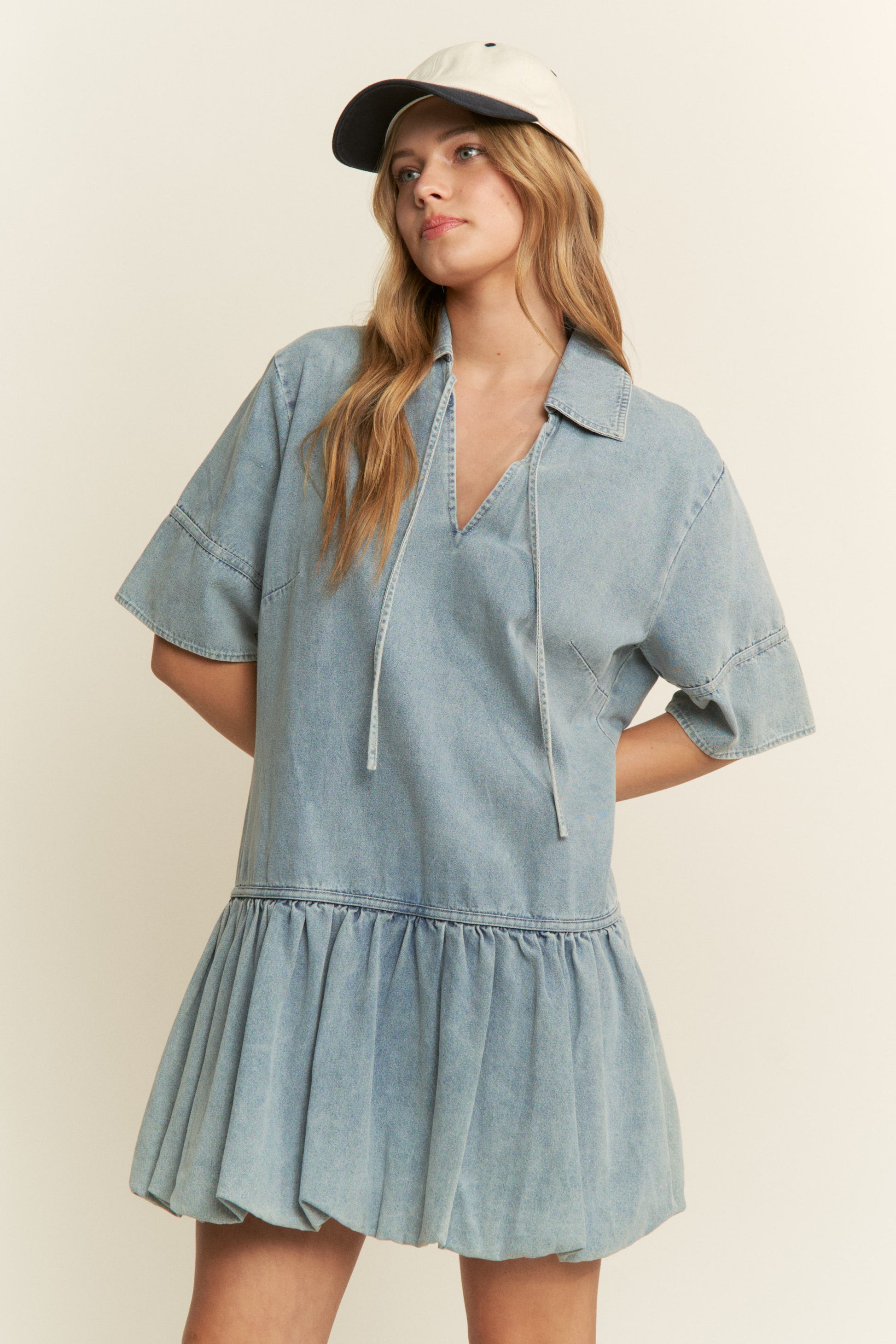 Oversize baby doll denim dress with bubble hem.