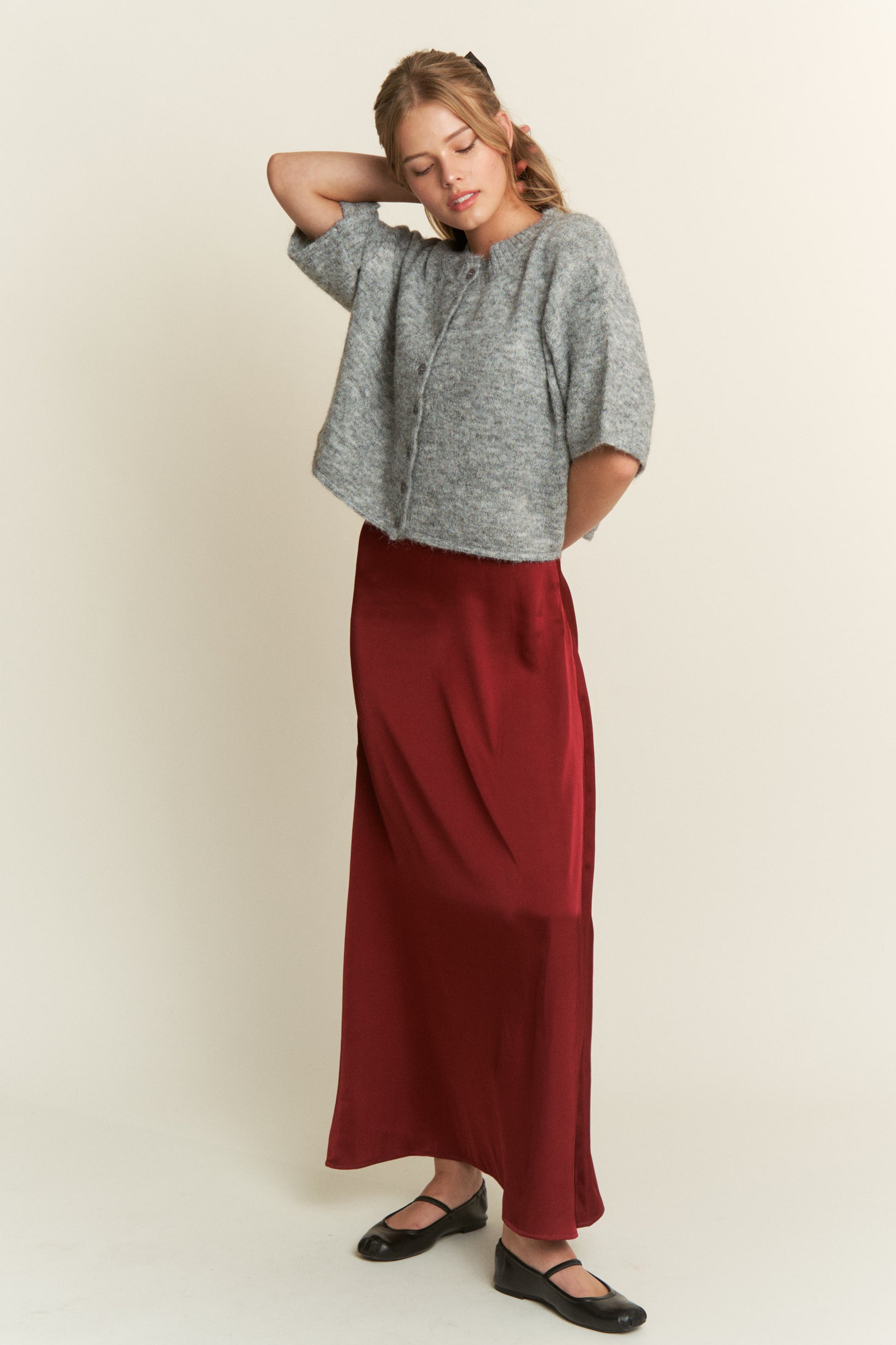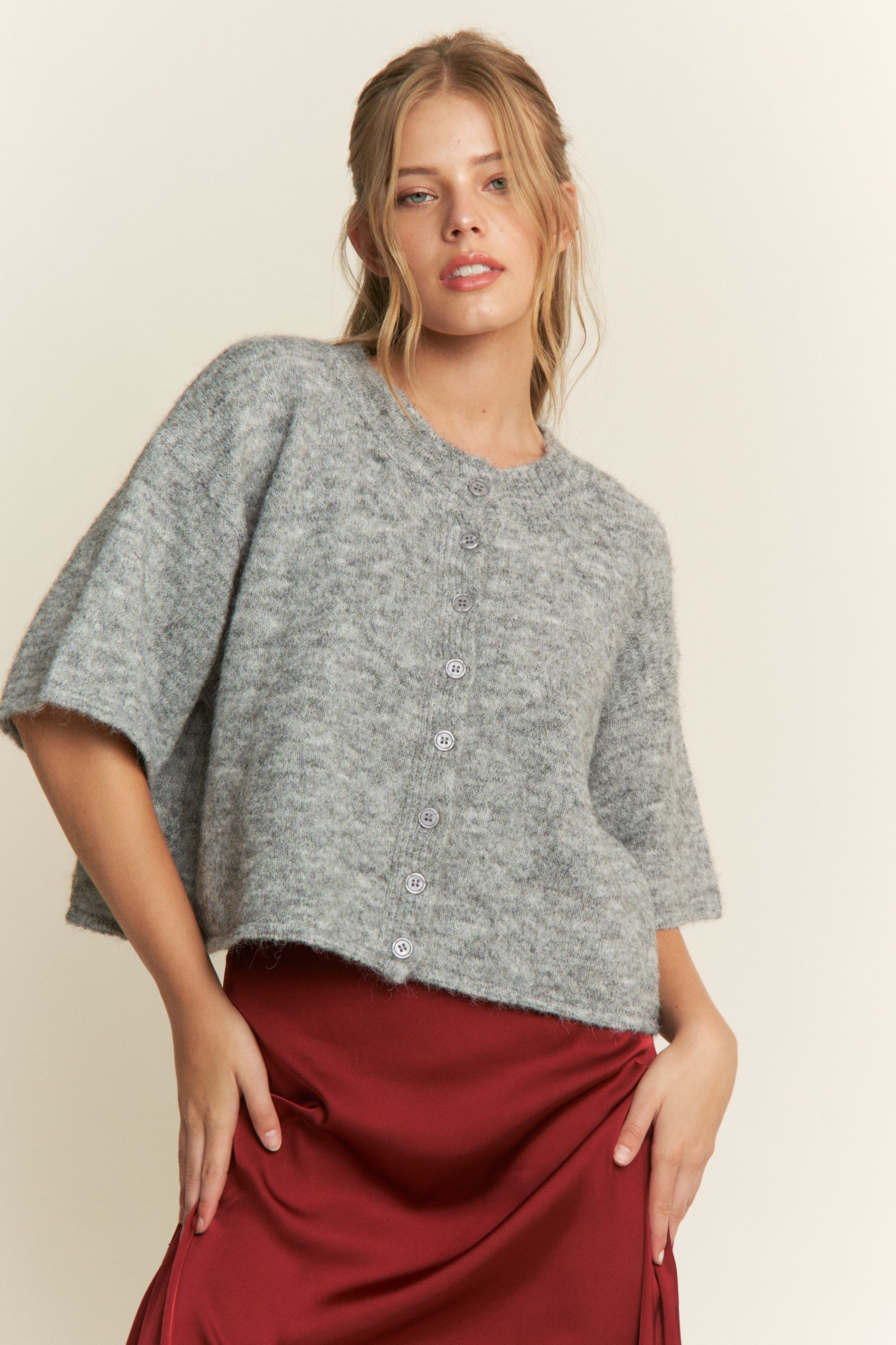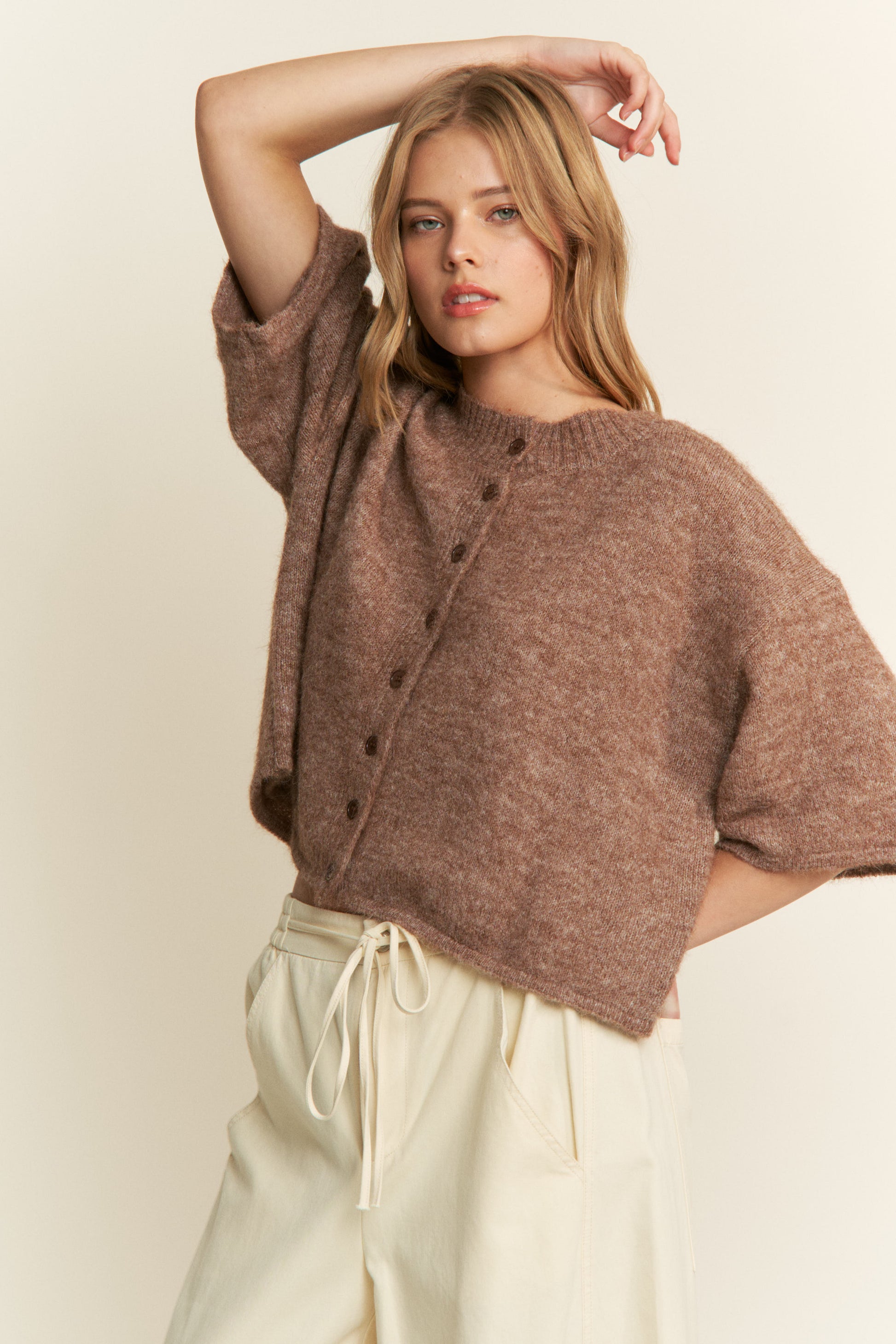 Fuzzy, soft, and lightweight cardigan with quarter-length sleeves and buttons.
