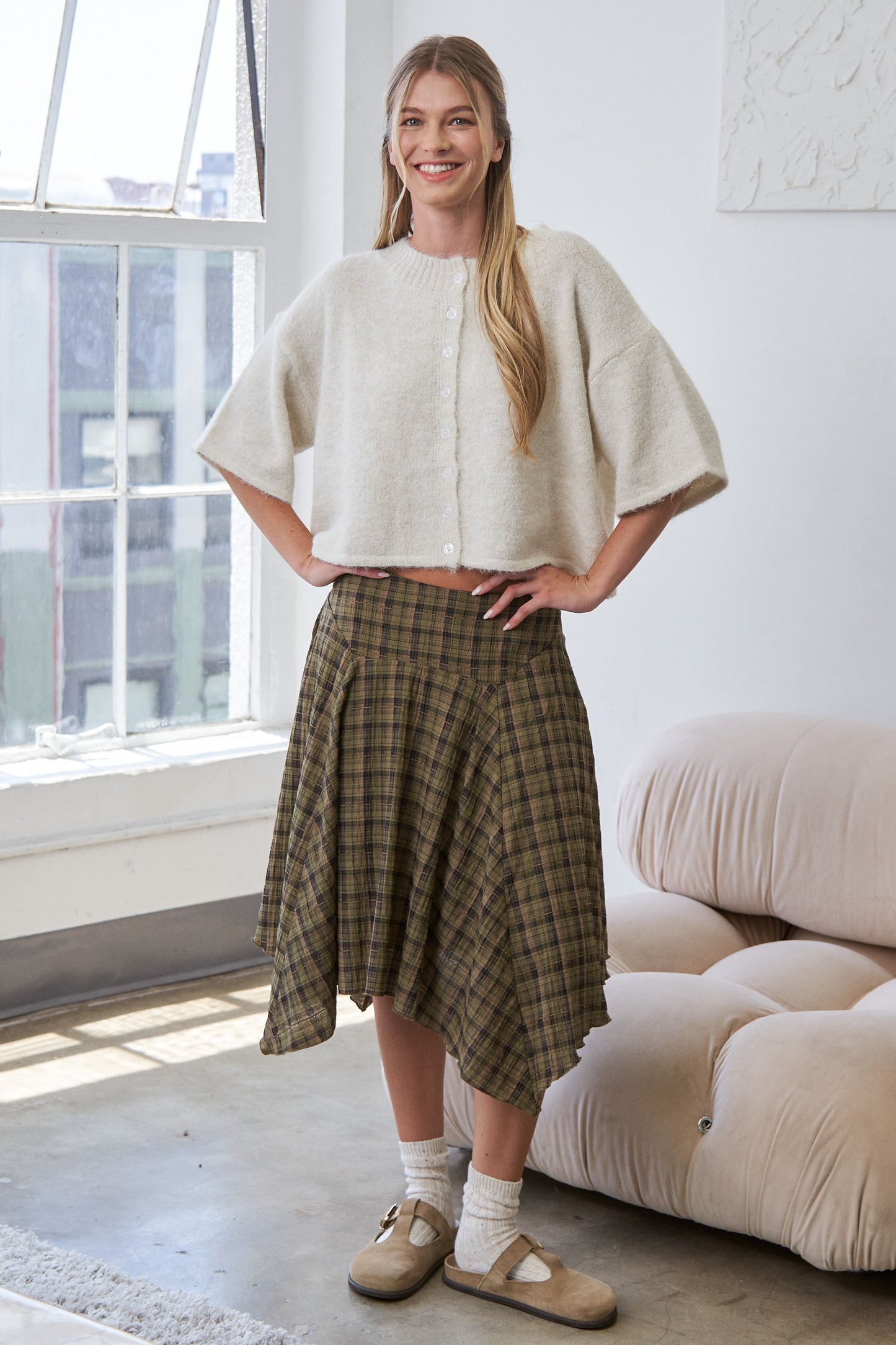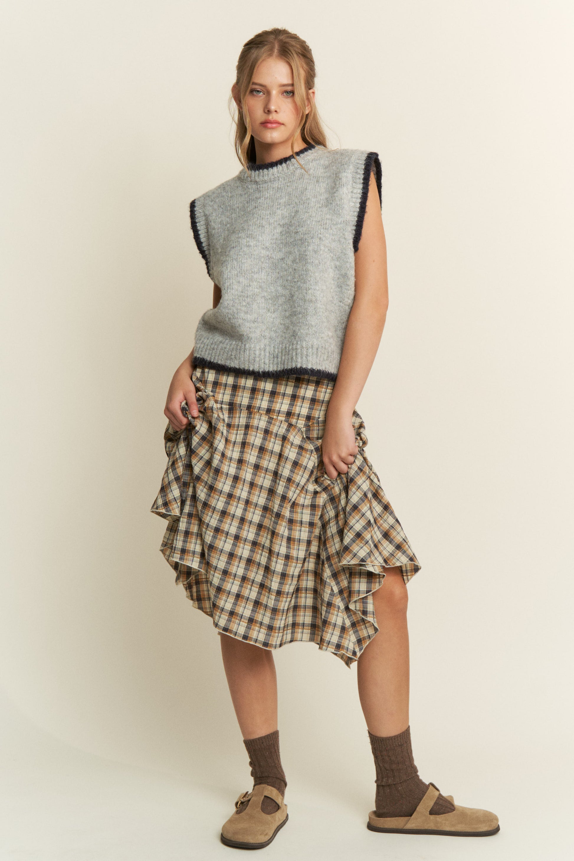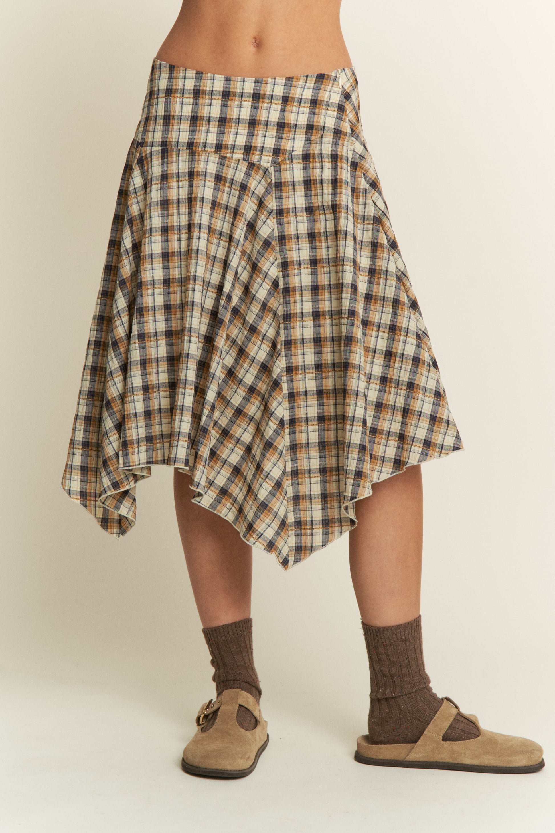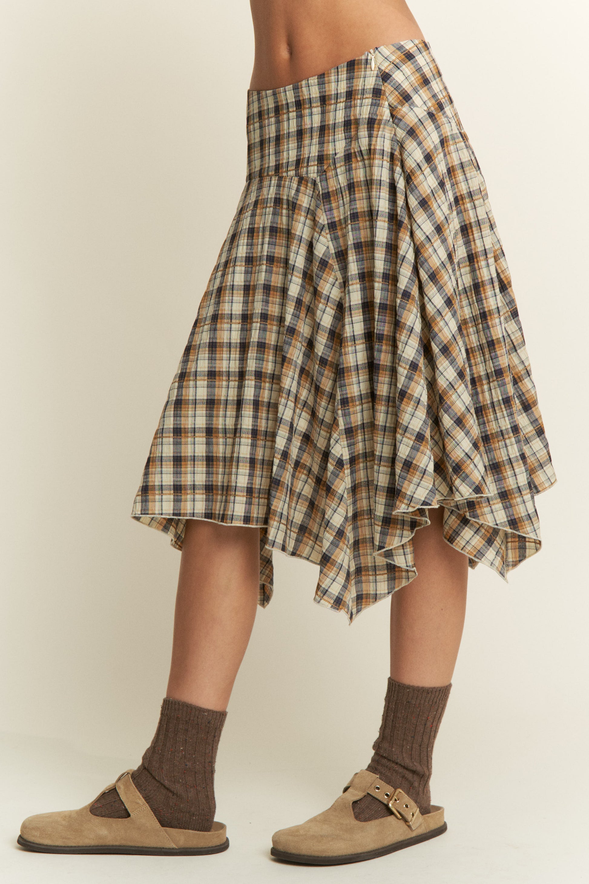 Plaid pattern with asymmetric drape midi skirt.