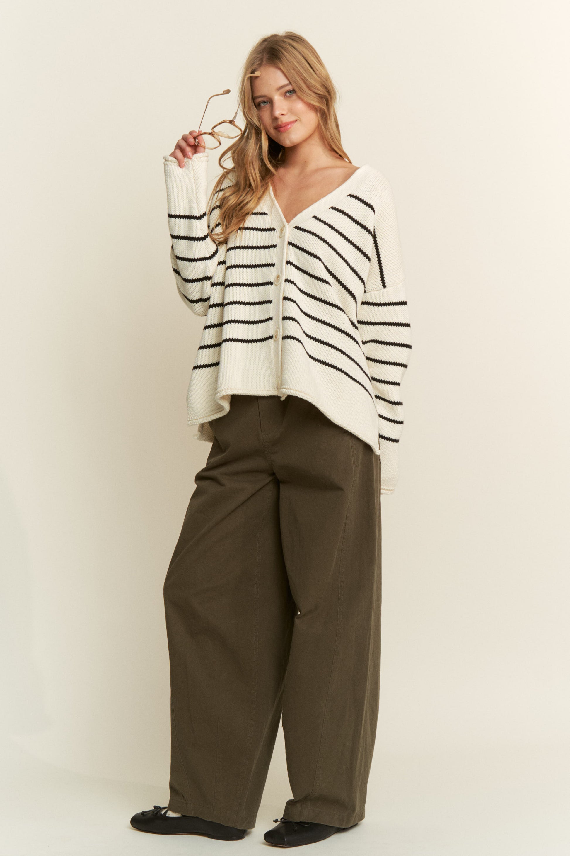Wide leg pants with slight barrel with front zip and button closure.